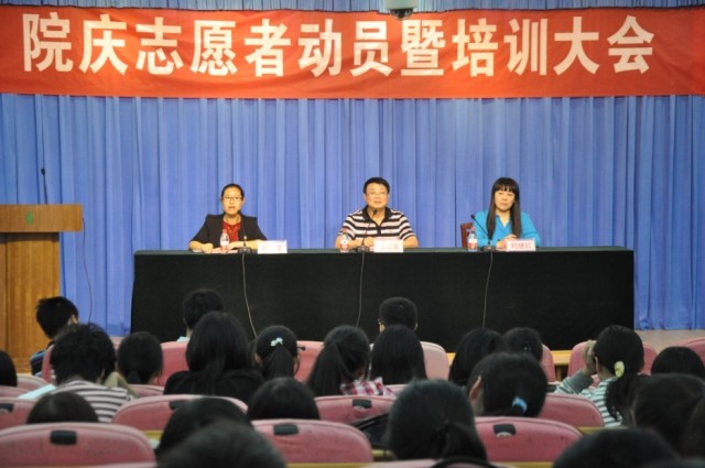 9月18日晚,我院院庆志愿者动员暨培训大会在草场门校区报告厅举行,党委副书记、副院长程建军,副院长刘继红出席大会。会议由团委副书记刘莹主持。