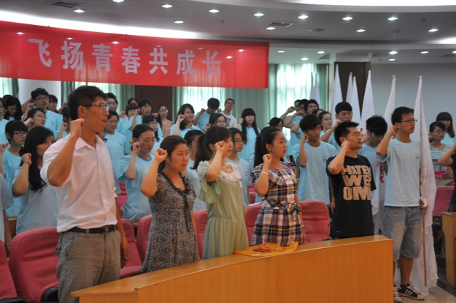 在热烈的掌声中,程建军为各实践团队授旗,全体队员庄严宣誓。会后,与会领导与社会实践团队全体队员合影留念。