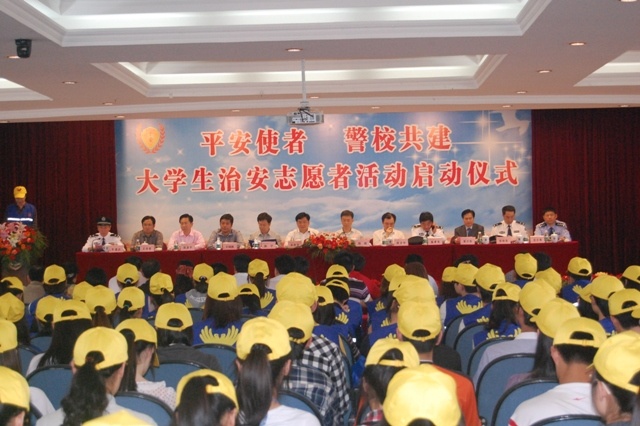 5月3日下午,南京市鼓楼区"警校共建"暨"平安使者"大学生治安志愿者活动启动仪式在南京医科大学报告厅举行。南京市副市长、公安局长徐珠宝,南京市政府副秘书长孙宁,鼓楼区区委常委、政法委书记、副区长周文中,南京市公安局副局长葛孝先、鼓楼区公安局局长车道正、政委唐长宝,我院副院长王培君及其他三所高校领导出席活动,南京公安系统相关职能部门领导、鼓楼辖区15所高校保卫处长、团委书记、学生代表等300多人共同参加了该活动。