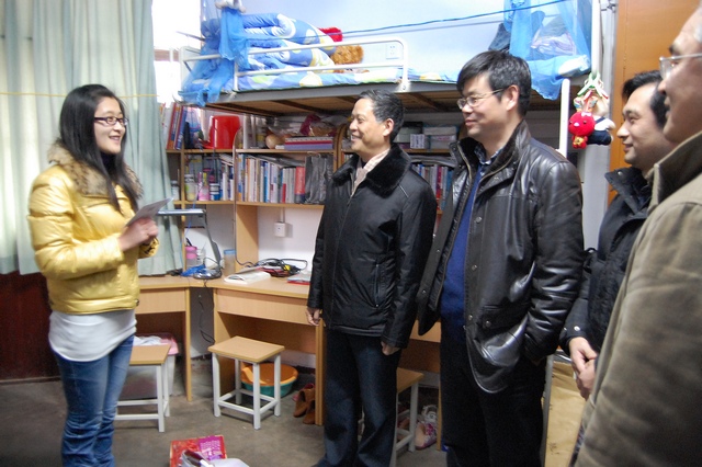 随后,刘书记一行来到草场门校区八号楼后面的平房,陈文军和他家人就住在这里。在数信院孙玫副院长、杨嵘副书记的陪同下,刘书记一行与陈文军一家三口亲切交谈。陈文军患有肌无力症,行动缓慢,对正常人而言的轻松自如的坐下,起立对他而言尤其困难,行走时需要搀扶,自2011年9月进校后一直由父母租房陪读,但该生一直严格遵守校纪校规,由于行动缓慢,他比正常人要提前1小时出门,早上8点上课从未迟到过。刘书记亲自将御寒品送到他父母手中,陈妈妈说:感谢学校的关心和和温暖。陈文军也表示:一定不辜负学校的殷切希望,努力学习,回报学校,回报社会。