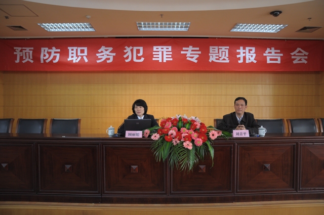 为全面贯彻落实党中央确定的"打防结合,标本兼治,重在治本"的方针和最高人民检察院《关于进一步加强预防职务犯罪工作的决定》,促进我院与鼓楼检察院的"校检共建"活动,进一步开展党风廉政教育,11月23日下午,我院在教科研楼511报告厅举行了预防职务犯罪专题报告会。鼓楼区检察院反贪局副局长顾丽娟应邀作了题为"当前高校职务犯罪形势及预防措施"的主题报告。副院长王仁雷,院长助理施忠出席报告会。全体中层干部,组织、人事、财务、教务、资产、后勤等部门的科长参加了会议。报告会由纪委书记刘青平同志主持。