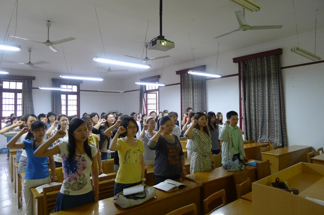 6月15日上午,外语系组织全体毕业生党员重温入党誓词、观看师德教育影片《凤凰琴》、进行"一个党员,一面旗帜"文明离校承诺。该系党总支书记陈建琴及部分教师参加。