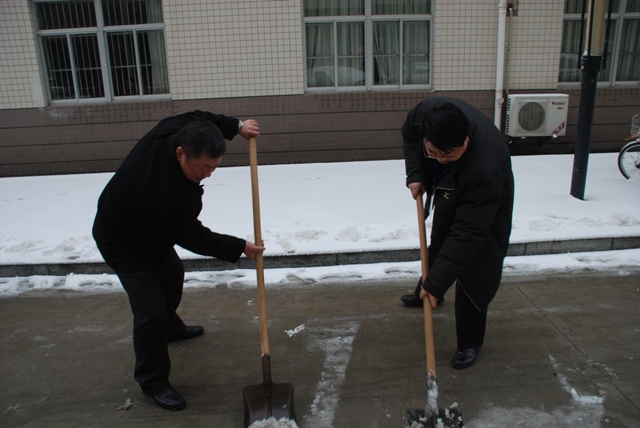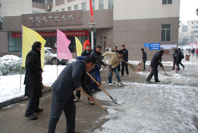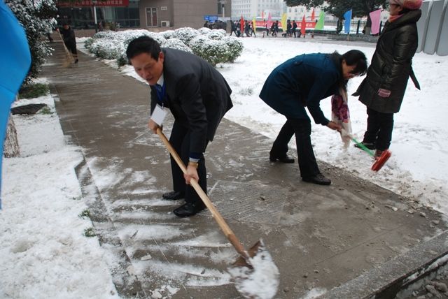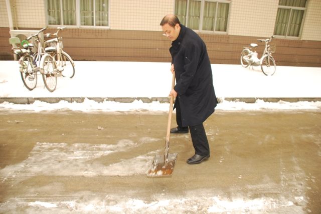 "两代会"进行计票间隙,在院党委书记管向群的倡议下,代表们来到校园内挥帚舞铲,扫雪清障。