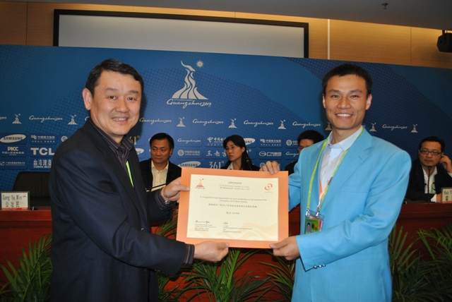 (国家体育总局社体中心副主任公冶民为陆老师颁发亚运会服务证书)