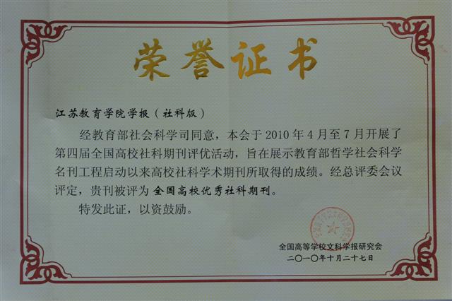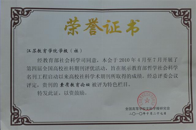 经教育部社会科学司同意,全国高等学校文科学报研究会于2010年4月至7月开展了第四届全国高校社科期刊评优活动,我院学报再获殊荣,被评为"全国高校优秀社科期刊","素质教育论坛"被评为特色栏目。