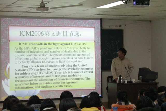 姚教授首先介绍了数学建模的内容、目标。他结合生动的示例,向大家介绍了数学技巧与方法的关系和重要程度,说明了方法在数学中的突破作用。接着,他详细介绍了国际、国内在数学建模领域的三项竞赛:1、中国大学生数学建模竞赛;2、国际数学建模竞赛(美赛)3、研究生数学建模竞赛,并对数学建模比赛的进行、学生的组队作了详细的指导。最后,姚教授强调了学校作好竞赛准备工作的重要性,指出学校应有专人负责、辅导,要开设相关课程,要做好暑假培训。