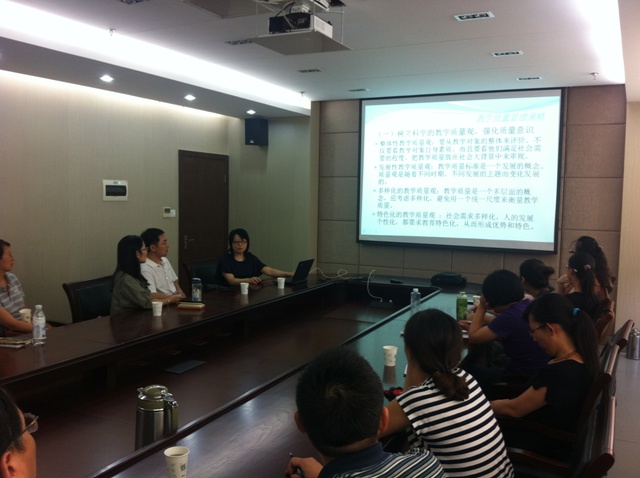 会上,徐群和应正兴分别以PPT的形式给大家做了“有质量的实施教学管理——教学质量管理点滴”和“教务管理工作——课务 考务 学籍 教务管理系统”的报告。徐群从教学质量管理内涵解读、教学质量管理环节剖析、教学质量管理策略和教学质量管理保障等4个方面对教学质量进行了阐述,强调指出教学质量是教学管理工作的基点,同时也是学校生存和发展的基础。应正兴则从课务、考务、学籍和教务管理系统等4个方面对教务管理工作进行了详尽、平实的讲解。与会人员就两位领导的报告内容进行了热烈的讨论。