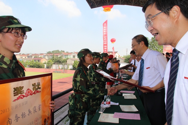 郭阳宣读了军训表彰决定。院领导为先进集体、内务标兵寝室、先进个人和优秀带队教师颁发了奖状。丁晓昌代表我院向承担施训任务的武警江苏总队第二支队赠送了锦旗。