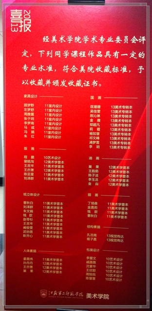 为进一步提高学生专业素质和创作能力,激发学生的内在潜能,经院务会讨论,美术学院决定建立学生优秀作品收藏机制。2013年12月,该院对学生课程作品进行了首次评定,涉及课程为家具设计、国画、版画、油画、纸立体设计、插画、结构素描、人体素描和包装设计九个方面,对具有一定专业水准,并符合美院收藏标准共计54人次的课程作品予以收藏并颁发收藏证书。2013年12月29日美院迎新晚会上,美院党总支副书记李铁英、美院副院长路明以及美院学术专业委员会部分老师为首次评定出的同学颁发了收藏证书。