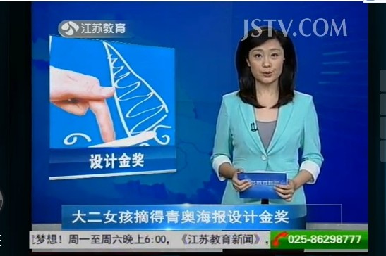 5月29日,江苏教育频道《江苏教育新闻》栏目报道我院美术学院12艺术设计班的周舒宁同学摘得青奥会海报设计大赛金奖。此次大赛面向全球15周岁以上的大、中学生和平面设计专业人士进行征集。周舒宁同学凭借作品《活力青奥》系列海报从4000多幅国内外优秀参赛作品中脱颖而出,荣获金奖。