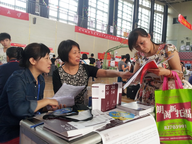 在淮安(淮安市体育馆)招生咨询会现场向考生家长解读我院招生政策