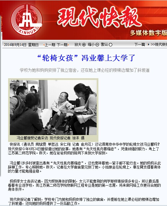 快报讯(通讯员 陶赋雯 单哲远 宋仁翔 记者 俞月花)还记得南京中华中学的轮椅女孩冯业馨吗?现代快报今年6月24日曾报道过她的故事,她患有“先天性肌肉萎缩症”,凭借顽强的毅力,考上了江苏第二师范学院。昨天,她在爸爸妈妈的陪同下来到大学报到。