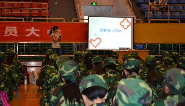 青春启航工作室尹步桥同学对所有参训学生进行了救护知识培训,从现代救护的目的、意义和救护方法几个方面详细介绍了现代救护的基本原则、胸外心脏按压和人工呼吸两种进行心肺复苏的方法以及气道异物梗塞的急救方法,并现场进行了胸外心脏按压演示。整个培训过程图文并茂,简单易学,对增强新生的急救意识和提高处理突发事件的能力有积极的推动作用。