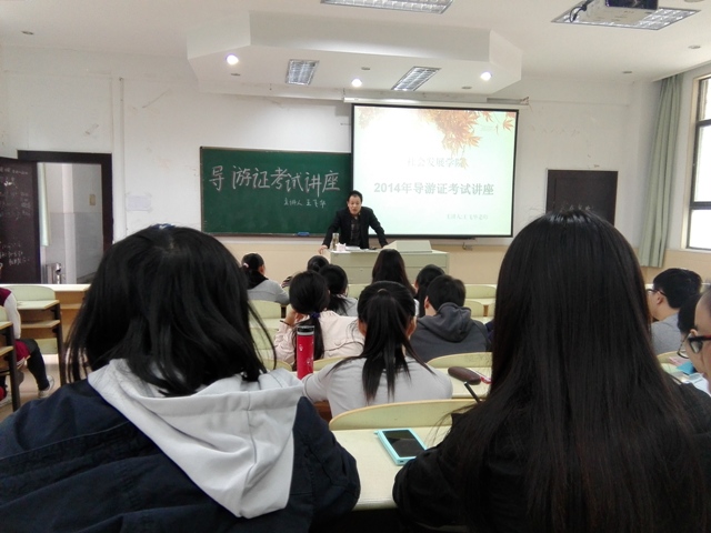 10月22日下午,社会发展学院在小行校区2108教室为旅游管理专业学生举办导游证考试指导讲座,南京国际翻译导游公司总经理王飞华应邀主讲。