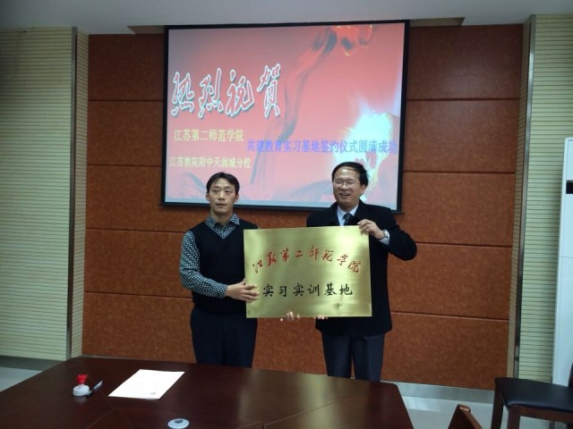 最后,双方举行实习基地签约挂牌仪式。江苏教育学院附属高级中学天润城分校实习基地的建立,将进一步丰富我院的实践教学资源,为进一步构建完善的实践教学体系奠定了良好的基础。