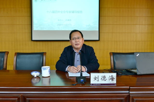 12月17日下午,我院在草场门校区511会议室举行学习党的十八届四中全会精神专家辅导讲座。省社科联党组书记、常务副主席,江苏省“党十八届四中全会精神宣讲团”专家刘德海应邀作专题辅导报告。院党委书记李洪天,院领导程建军、周成平、刘青平、刘继红、祝兴成、潘文,院中层干部、教师代表、辅导员参加报告会。报告会由周成平主持。