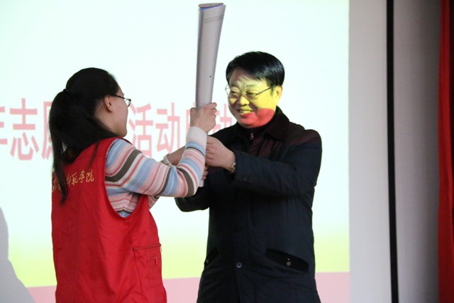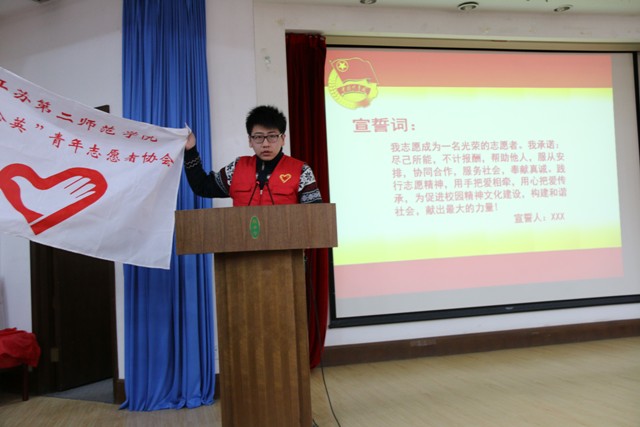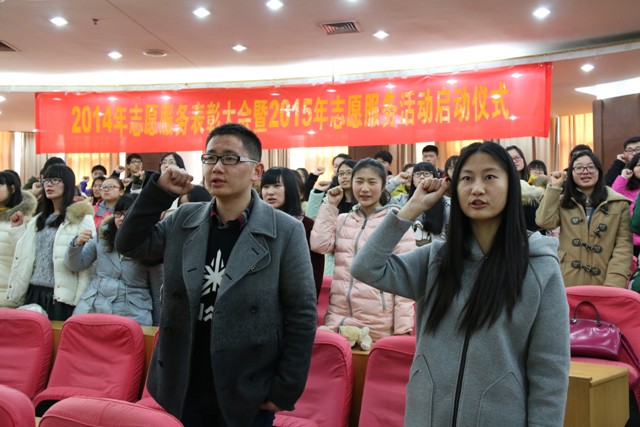 校学生会主席带领全体青年志愿者庄严宣誓,号召大家用手把爱相牵,用心把爱传承,为践行社会主义核心价值观、构建和谐校园贡献青春力量。