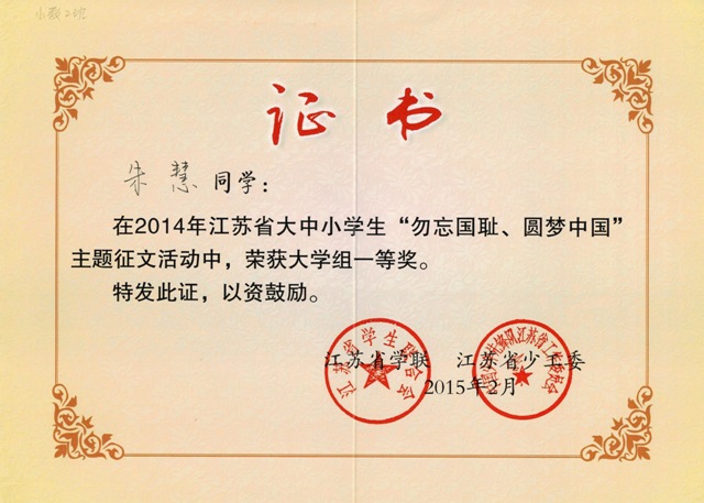 根据《关于在全省大中小学生中开展“勿忘国耻、圆梦中华”主题教育活动的通知》(团苏委联〔2014〕62号)文件精神,自2014年9月以来,全省各大中小学在学生中开展“勿忘国耻、圆梦中华”主题征文活动。我院对此次征文活动高度重视,学工处、团委精心组织、广泛动员,在校学生踊跃参与,经院系报送,学校组织评审,最终筛选出43篇优秀作品上报团省委学校部参加全省高校组征文评比。经评审,我院共有八位同学在此次征文大赛中获奖,其中朱慧同学获得一等奖,颜朵、尹敏两位同学获得二等奖,侯璐、陈熳瑜、符程、陶新、王颖五位同学获得三等奖。