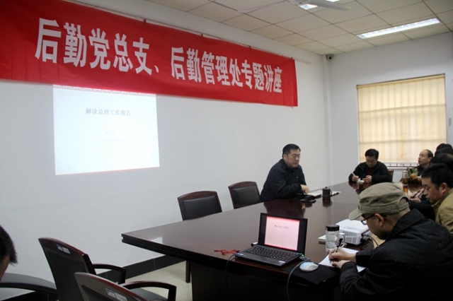 3月18日下午,后勤党总支、后勤管理处举行专题讲座,副院长祝兴成为大家解读了总理工作报告。后勤管理处全体员工及保卫处员工共五十余人参加。讲座由后勤党总支书记傅磊主持。