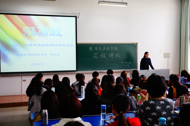 4月15日,经法学院“石城讲坛”通识教育讲座第一场在浦口校区举办,我院02届校友、建邺高级中学政治教师朱晓敏老师应邀主讲。