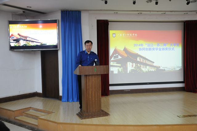 5月21日下午,我院在草场门校区现代教育技术楼二楼报告厅隆重举行2014年“沿江-苏二师”大学生协同创新奖学金颁奖典礼暨优秀事迹分享会。院党委副书记、副院长程建军,副院长祝兴成出席会议,教务处、财务处、招就处、团委、浦口校区管委会等部门负责同志,各学院学生工作负责人、学工办主任、辅导员及部分学生代表参加会议。会议由学工处处长刘莹主持。