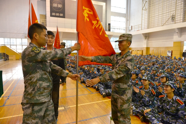 最后,刘莹向军训团梁新磊军官授军训团团旗,各营长为11个军训连连长授军训连连旗。