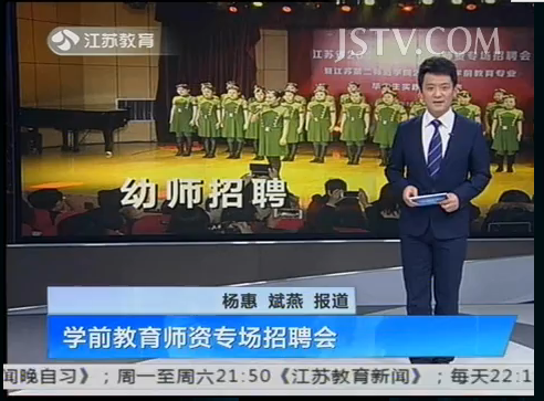1月9日,我院在草场门校区举办江苏省2016年学前教育师资专场招聘会暨江苏第二师范学院2016届学前教育专业毕业生实践技能展演。来自全省的13所高校,59所公办幼儿园,41所民办幼儿园及14家培训机构举办了专场招聘活动。江苏教育频道《江苏教育新闻》作了报道。