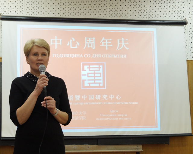 “汉语暨中国研究中心”中方主任翟洪云致辞,她对中心一年来取得的成绩进行了回顾,对莫州大校长和友好人士表示衷心感谢。莫州大语言系主任伊琳娜·别里亚耶娃发表讲话,对中心一年来的工作表示肯定,对今后的工作提出希望。她说,“汉语暨中国研究中心的成立,给莫州大学习汉语的学生提供了交流的平台和了解中国的窗口,开展的活动有显著的中国特色,受到俄罗斯大学生的欢迎”。