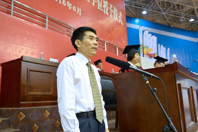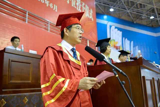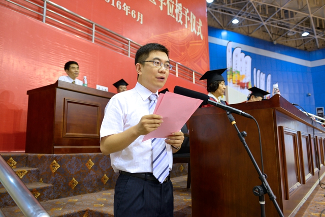 李洪天宣读2016届“优秀毕业生”表彰决定。在雄壮优美的乐曲声中,毕业典礼进入高潮。学校各级领导为“优秀毕业生”颁发荣誉证书,为全体毕业生颁发毕业证书,为每一位学士学位获得者扶正流苏、授予学位并合影留念。