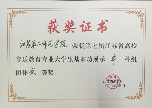 在8月29日结束的江苏省高校音乐教育专业大学生基本功(五项全能)比赛中,我校三名参赛同学经过钢琴演奏、歌唱与伴奏、自弹自唱、乐器演奏、指挥等项目的全面角逐,最终获得本科组团体二等奖(全省15所参赛本科院校中排名第四)。另外,三人在个人单项中都有斩获,钱文同学获得个人全能一等奖,器乐演奏单项奖第一名,自弹自唱单项奖第三名;钱家莹同学获得个人全能二等奖,钢琴演奏单项奖第十名;郭雯昕同学获得自弹自唱单项奖第五名。