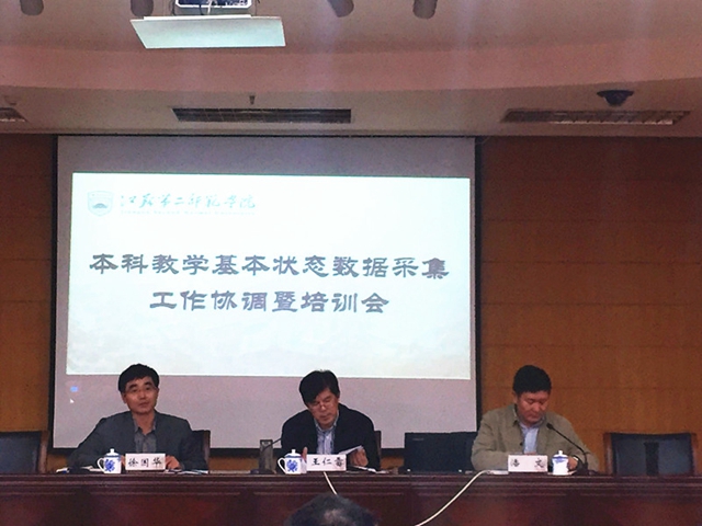 10月24日下午,我校在草场门校区教科研楼511召开2016年度本科教学基本状态数据采集工作协调暨培训会。院长王仁雷,副院长徐国华出席会议并讲话,副院长潘文主持会议。各相关部门主要负责人及数据填报工作人员参加会议。