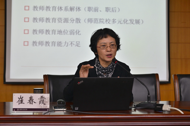 崔春霞围绕教师教育、教师队伍建设存在的问题展开论述,对教师的科研方向和研究重点给出指导。她期望我校广大教师能以问题为导向,以政策研究和实践研究为重点,为教育行政决策提供咨询,为基础教育改革实践服务。