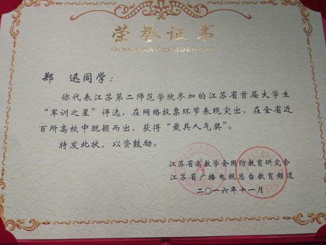 我校在江苏省首届大学生“军训之星”评选中荣获佳绩