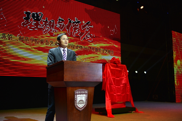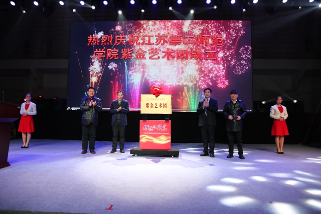 在音乐和礼花中,韩后军、张鲤鲤、张小军、李洪天共同为紫金艺术团揭牌,姚振标代表我校接受紫金农商银行捐赠的艺术教育发展基金。