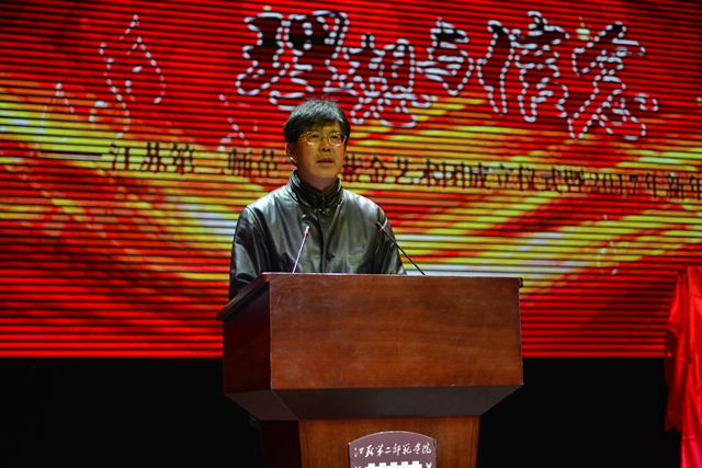 晚上6点30分,晚会开始。王仁雷代表校党政,向百忙之中莅临晚会的的各位领导、来宾表示热烈的欢迎,向长期以来给予学校事业发展大力支持的紫金农商银行和社会各界朋友表示衷心的感谢,向全校师生致以新年的问候和良好的祝愿。王仁雷指出,学校一贯高度重视校园文化建设和艺术教育开展,不断推进艺术教学改革,广泛开展各类文体活动,营造了良好的校园文化氛围,获得诸多荣誉。为积极响应党中央和省委号召,进一步提升校园文化建设水平,在紫金农商银行的大力支持下,学校成立历史上第一个综合性大学生艺术团体——紫金艺术团。这是紫金农商银行关心高等教育发展、丰富师生文化生活的务实举措和热情帮助,也是我校和紫金农商银行之间开展校企合作、实现互利共赢的生动实践。