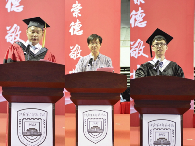 毕业生代表、物理与电子工程学院贾晨旭发言。他回顾了四年的成长之路,并表示:作为一个二师人,将传承甘为人梯的师范精神,扎根基层、甘于奉献、传道授业,坚守杏坛,承担起时代的责任。