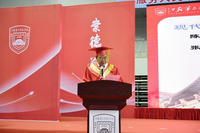 校领导李洪天、王仁雷、刘继红、潘文、姚振标、徐国华、胡相峰等身着导师服出席典礼。各相关职能部门领导、各二级学院负责人,毕业班班主任、辅导员、毕业生家长代表和全体应届毕业生参加典礼。校友时明、音乐学院教师苏侨主持典礼。