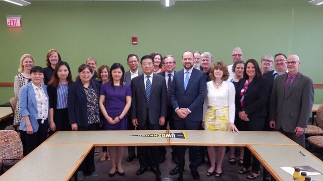 威斯康星大学奥斯格斯分校是威斯康星州第三大的大学,在本科教育方面,它排在公立大学第三位。6月29日,奥斯格斯分校校长携部分部门负责人热情接待李洪天一行。双方签订国际交流合作协议,并就合作专业、培养方式、课程设置、合作内容等进行初步商定,重点对学科教育的“3+1+1”培养项目、商科专业MBA项目实施进行商议,确定教师、学生的双向交流机制。