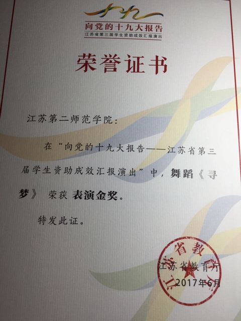 日前,我校音乐学院郝纯老师指导的群舞《寻梦》在“向党的十九大报告——江苏省第三届学生资助成效汇报演出”中因表现优异,荣获由江苏省教育厅颁发的编舞金奖。