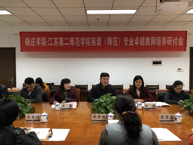 4月4日下午,南京晓庄学院教务处处长张素云、外国语学院院长汪壁辉率外国语学院相关人员来我校,就英语专业卓越教师培养工作进行研讨。副校长潘文,教务处副处长陈蓓,外国语学院党总支书记、副院长张莉,党总支副书记黄晓波,英语专业相关教研室主任和两办主任参加会议。张莉主持会议。