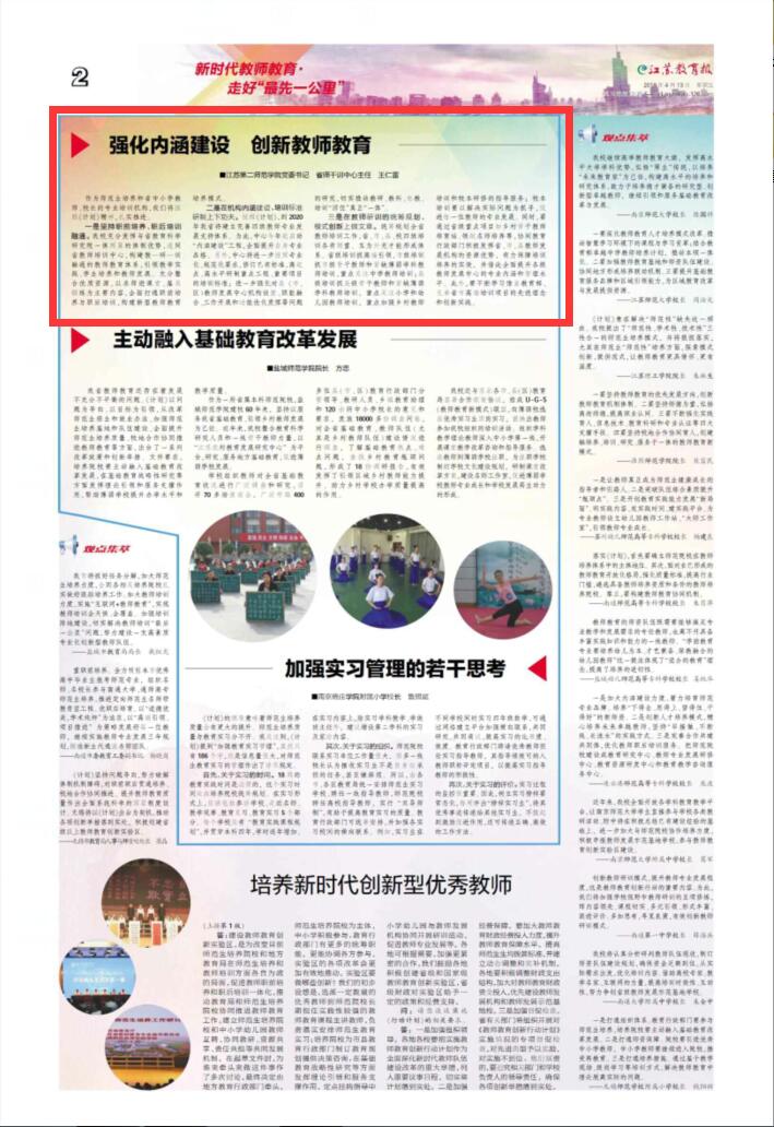 4月13日的《江苏教育报》在重要版面头条位置刊登了党委书记王仁雷对《江苏省教师教育创新行动计划(2018—2022年)》的解读:《强化内涵建设 创新教师教育》。