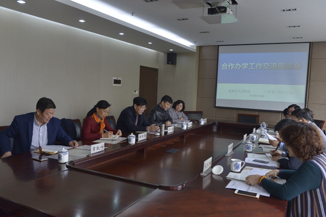 4月16日上午,我校与南京市建邺区合作办学工作交流座谈会在草场门校区召开。党委书记王仁雷、副校长潘文、发展办主任章跃一、教务处处长徐新萍、学前教育学院院长尹坚勤,建邺区政府副区长王国平,教育局局长张石明,教育工委书记肖东、副书记程东红,副局长杨阳等出席。