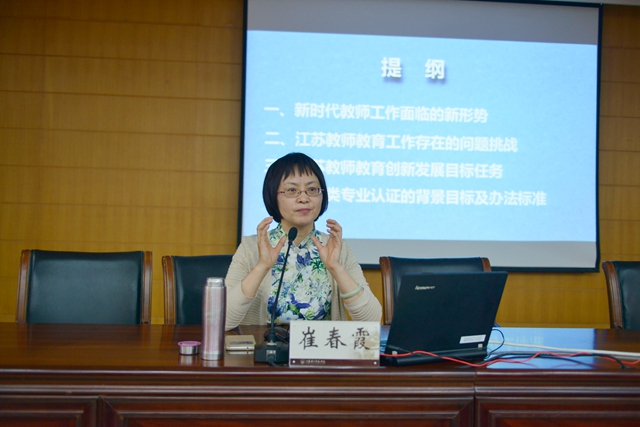 崔春霞详细解读了《关于全面深化新时代教师队伍建设改革的意见》(以下简称意见)等上级有关文件精神,从新时代教师工作面临的新形势、江苏教师教育工作存在的问题挑战、江苏教师教育创新发展目标任务、师范类专业认证的背景目标及办法标准四个方面作了题为《江苏教师教育创新发展》的辅导报告。她指出,《意见》是建党建国以来第一次以中共中央文件形式印发的教师工作文件,提出了新时代建设高素质专业化创新型教师队伍的目标任务,明确了行动纲领。《意见》的颁布实施,充分体现了以习近平同志为核心的党中央对新时代教师队伍建设的高度重视。学习贯彻落实好《意见》以及其它有关文件精神,是当前和今后一段时期师范院校的重点任务。