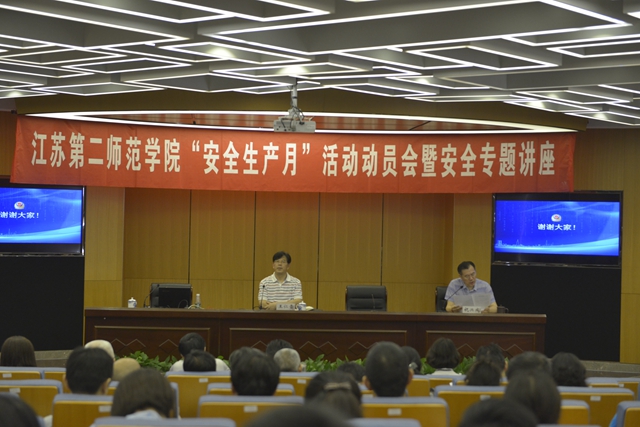 为落实省委省政府、省教育厅关于安全生产工作的决策部署,进一步推动安全工作持久长效发展,6月13日,我校举办“安全生产月”活动动员部署会暨安全知识讲座,党委书记王仁雷,校长王建,校领导张勤、刘继红、祝兴成、王晓天出席会议,全校科级以上干部参加会议。会议由副校长祝兴成主持。