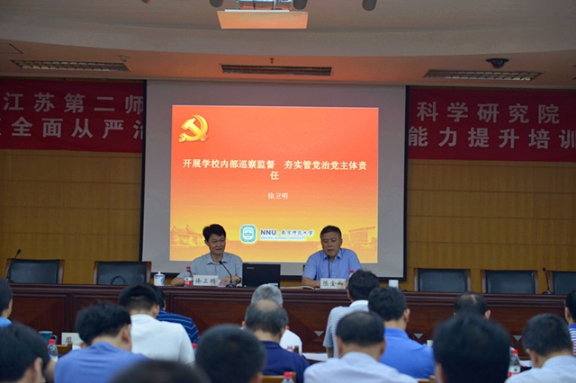 7月4日下午,院纪委在草场门校区举办“聚焦全面从严治党暨纪检监察干部能力提升培训班”。党委书记王仁雷出席开班仪式,南京师范大学纪委书记徐卫明应邀作专题讲座,党委系统职能部门负责人、各总支直属支部书记、全体纪委委员、各二级党组织纪检委员以及纪委办全体工作人员参加本次培训。纪委书记陈金如主持本次培训班开班仪式。