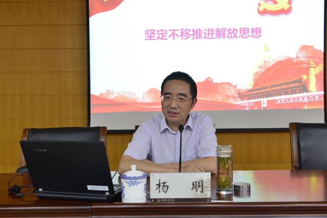 杨明作题为“坚定不移推进解放思想”的报告,从“解放思想是共产党人的法宝”,“以问题为导向推动思想解放”,“以思想大解放开辟实践新境界”三个方面对解放思想的内涵实质、主要任务作了精辟解读和系统阐释。杨明系统深入地回顾了党的历史上历次大的思想解放行动,重温了习近平总书记有关解放思想的一系列重要讲话精神和省委推动思想解放的部署要求,强调要坚定不移用新思想武装头脑、新使命指导实践,努力破除与新时代、新形势不相适应的思维定势和工作方法,用创新的思路解决工作实践中的问题,用务实的举措推动地方经济社会发展质量的全面提升。他特别指出,大家要敢于解放思想、善于解放思想,不断提振干事创业的精气神,做一个敢于担当作为的合格干部、优秀干部。