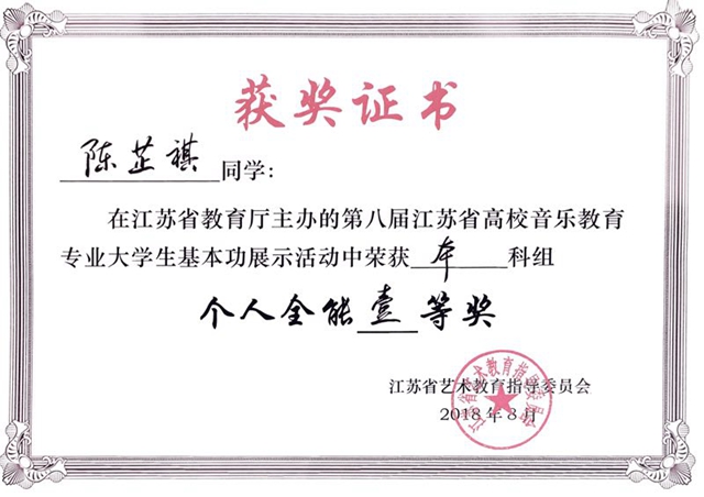 8月21日、22日,由江苏省教育厅主办的全省第八届普通高校音乐教育专业大学生基本功比赛在南京举行。根据规定,我校音乐学院选派陈芷祺(推荐)、王淞(抽签)、江婷婷(抽签)三位同学代表我校音乐学专业学生参加钢琴演奏、歌唱与伴奏、自弹自唱、器乐演奏、合唱指挥、微课等项目的角逐。最终,在参赛的16所本科院校队伍中,我校获团体一等奖;陈芷祺、王淞、江婷婷三位同学也分获个人全能一、二、三等奖,并获数项单项奖。