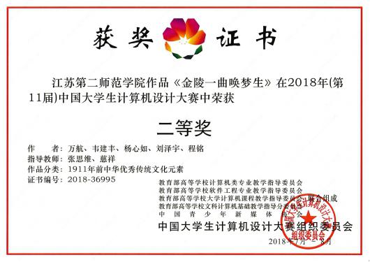 日前,2018年第十一届中国大学生计算机设计大赛举行全国总决赛。我校现代传媒学院学生作品《金陵一曲唤梦生》荣获“数字媒体设计类中华优秀传统文化元素微电影组”全国二等奖。