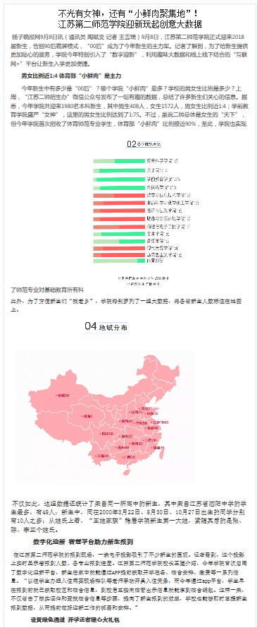 近日,多家主流媒体报道了我校9月8日开学迎新盛况。江苏教育频道、南京教育频道等电视媒体通过视听影像展现了我校迎新活动的特色与活力;现代快报、南京晨报、金陵晚报、扬子晚报、中国江苏网等多家媒体从“我校体育师范首次招生,实现师范专业全科覆盖”、“音乐定向师范高分考生钟情师范,毕业后回家乡传承笛艺”、“师范专业受青睐,牛娃们看中技能培养和就业前景”、“特色迎新:校长化身暖心大白迎萌新”、“数字迎新:玩转趣味大数据和互联网+,新生入学更加便捷。”这些角度来多方位全方面展示我校教育创新理念与迎新工作的出色成绩:南京晨报重点报道了我校今年新开的体育师范专业,该专业男女比例为7:1,与我校超过80%女生的情况有一定的反转;现代快报对我校乡村定向音乐专业高分考生吴倩雯做了专访;扬子晚报报道了我校趣味大数据系统的运用,包括新生生源地域分布,帮助新生找老乡、各专业男女比例情况、个人生活习惯宿舍分配情况。