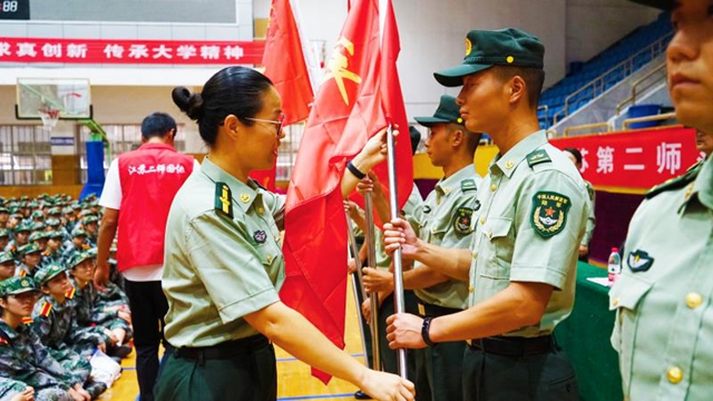 刘莹向军训团授军训团团旗,为各连连长授军训连连旗。